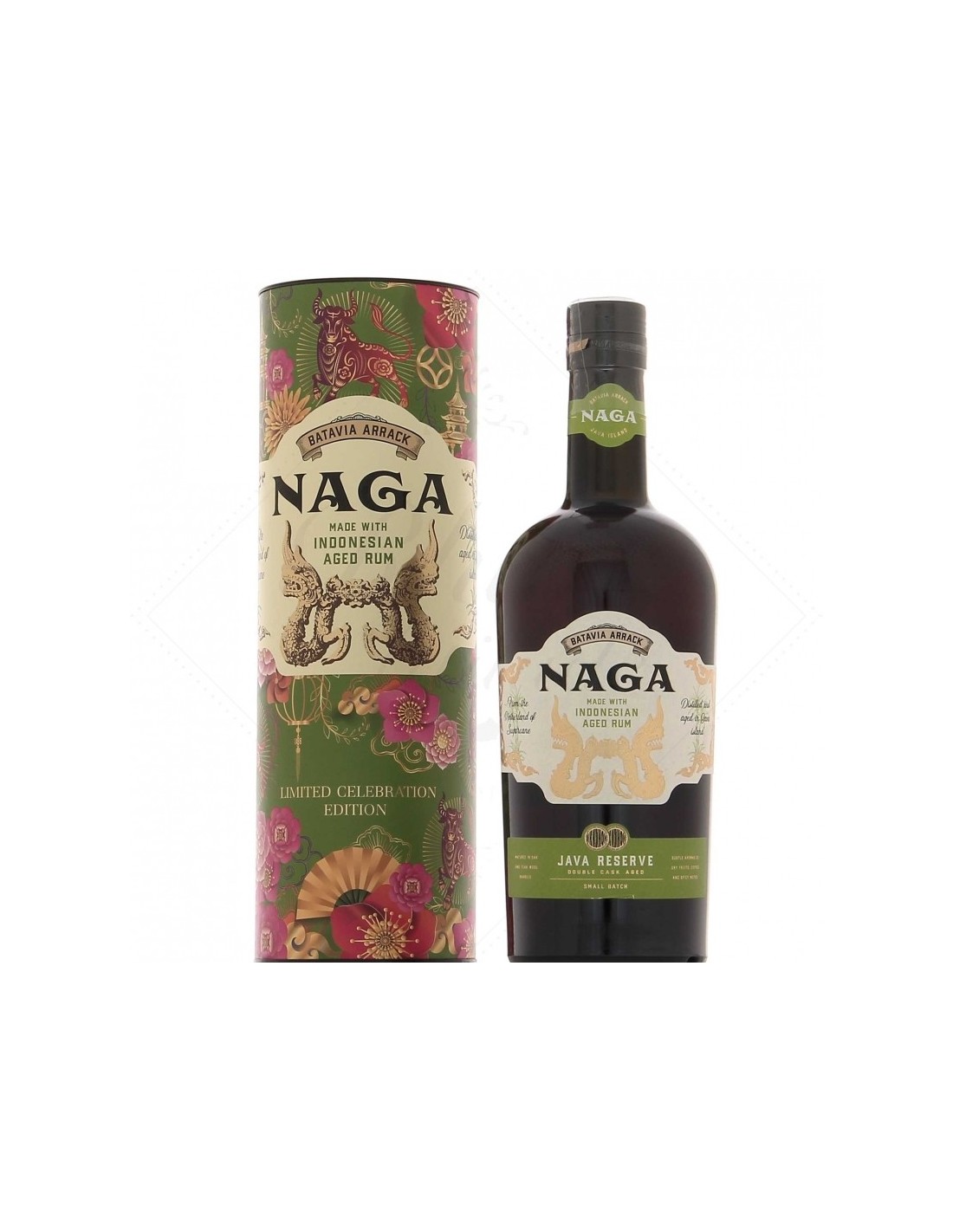 Naga est produit au nord de l'île de Java selon un procédé ancestral de distillation asiatique: la fermentation de la mélasse est boostée par l'ajout de levure de riz rouge javanais malté. Il est vieilli en fûts de jati, un bois exotique local, puis en fûts de bourbon.