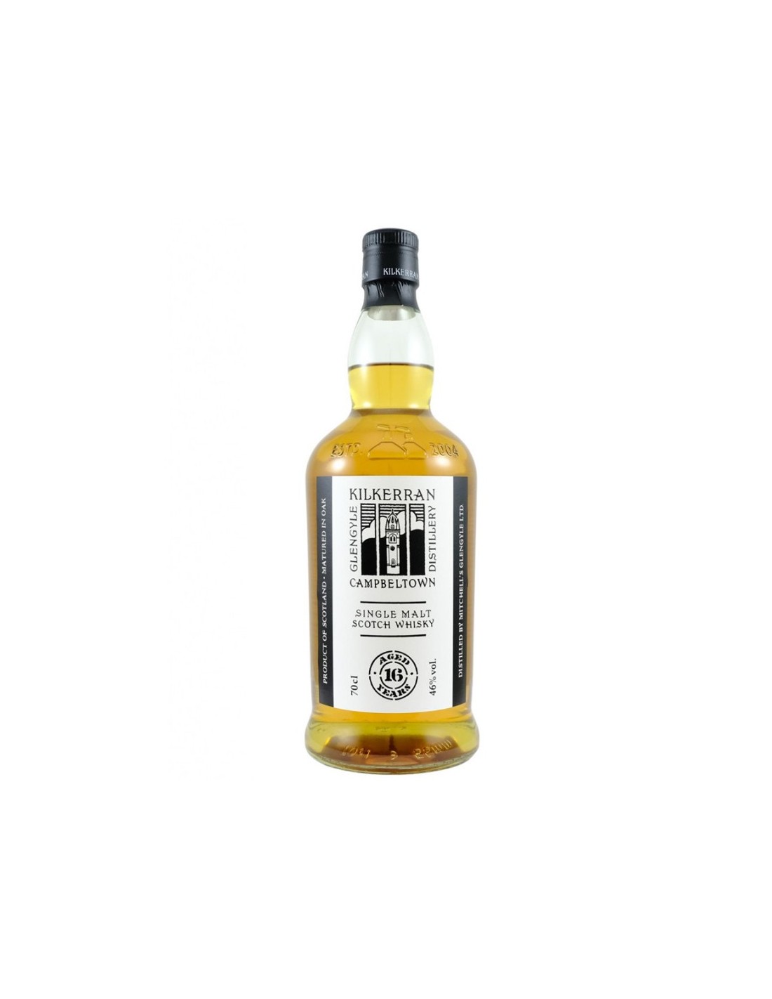 Dernier né des Single malts de la région de Campbeltown, Kilkerran est l’un des rares whiskies à ne pas porter le nom de sa distillerie. Cette volonté nous vient du propriétaire de Springbank qui, en 2004, relance l’activité de la distillerie Glengyle en élaborant les Single malts Kilkerran. Le whisky Single malt Kilkerran 16 ans est légèrement tourbé. Il a vieilli 16 ans en ex-fûts de Bourbon. Son nez s’ouvre sur des arômes de citrus et d’agrumes. A l’aération le crémeux d’une tarte aux citrons meringuées se révèle. Des notes de fruits secs avec un soupçon d’ananas achèvent ce nez déjà envoûtant, véritable signature des Single malts de Campbeltown. La bouche, riche et onctueuse, dévoile des saveurs de céréales enveloppées par une fumée délicate. Des notes herbacées, de poivre noir apparaissent puis s’estompent pour offrir une fraicheur anisée avec en toile de fond la tourbe et la fumée typique des Single malts de Campbeltown.